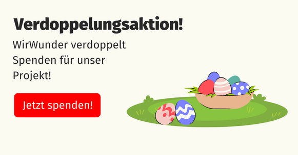 Vom Mittwoch, 08. April 2026, 09:00 Uhr bis Freitag, 10. April 2026, 23:59 Uhr veranstaltet die Sparkasse auf WirWunder eine Verdoppelungsaktion und unser Projekt ist dabei. Das heißt: Jetzt brauchen wir deine Unterstützung! Denn Spenden werden bis zum 10. April, 23:50 verdoppelt, das heißt, noch mehr Geld kommt unserem Projekt zugute. Und schnell sein lohnt sich, da es nur ein begrenztes Budget gibt.