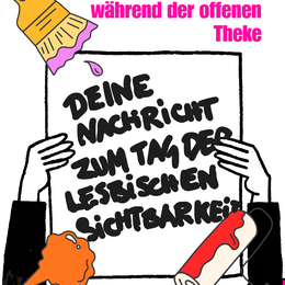 Zum Tag der lesbischen Sichtbarkeit wollen wir eure Nachricht hören. Am 9.4. und 10.4. könnt ihr während der offenen Theke Schilder und Plakate malen. Materialien stellen wir bereit, aber bringt gerne eure eiegenen Sachen mit, wenn ihr wollt.