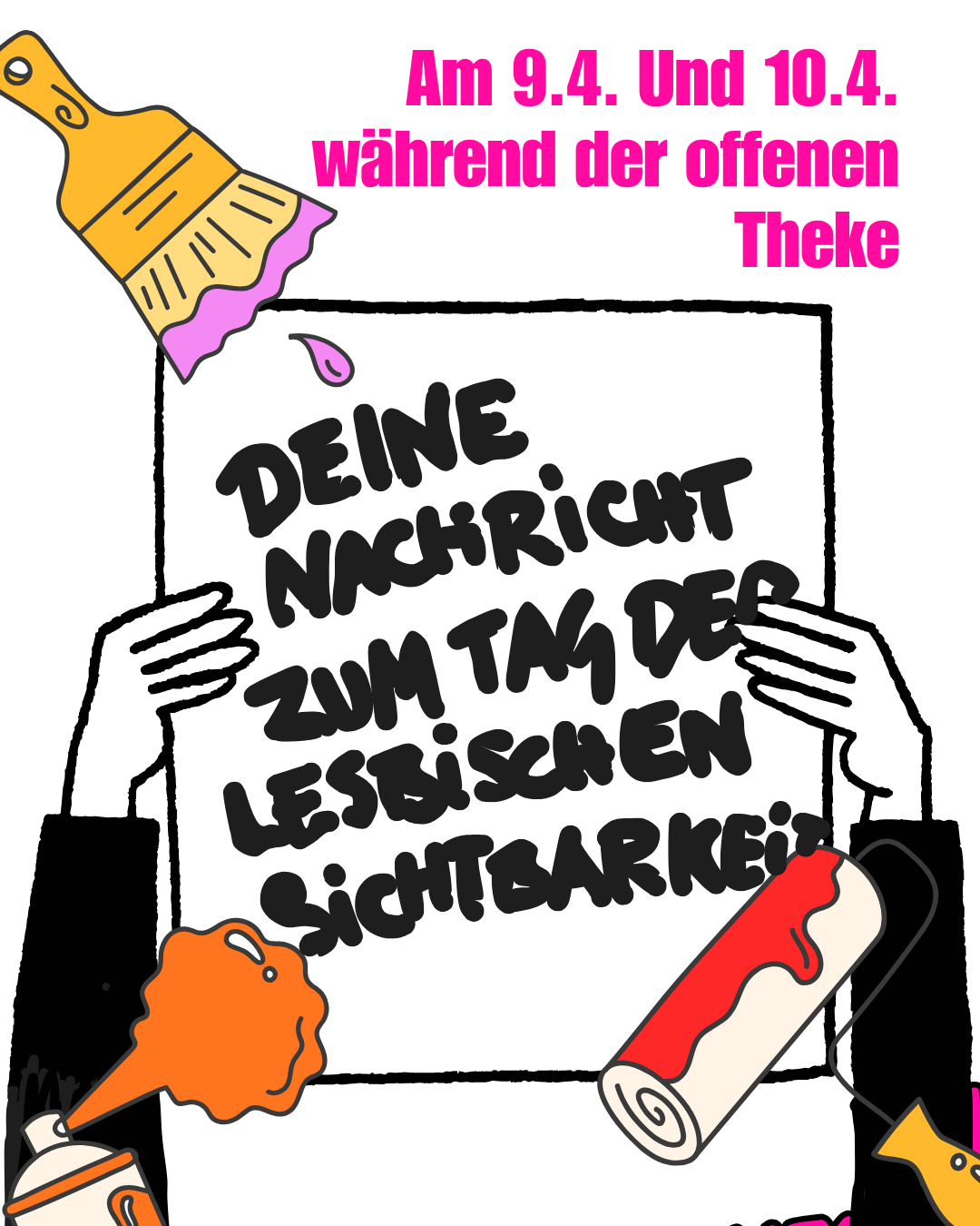 Zum Tag der lesbischen Sichtbarkeit wollen wir eure Nachricht hören. Am 9.4. und 10.4. könnt ihr während der offenen Theke Schilder und Plakate malen. Materialien stellen wir bereit, aber bringt gerne eure eiegenen Sachen mit, wenn ihr wollt.